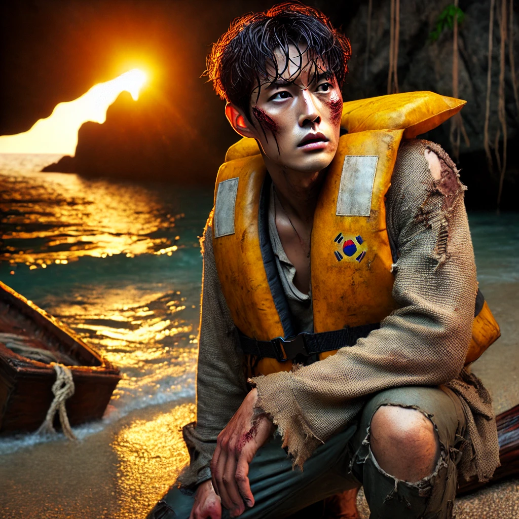 이도현은 중얼거리며 안도의 한숨을 쉬었다. 죽을 뻔했는데 기적적으로 살아났다. 그것도 육지에... 아니 섬이지만 어쨌든, 바다가 아닌 곳에 도착했다. 그는 조심스럽게 자신의 몸을 움직여 보았다. 다행히 큰 부상은 없는 것 같았다. 몸 곳곳이 아프긴 했지만, 움직일 수는 있었다. 구명조끼도 여전히 착용하고 있었고, 허리춤의 수통 2개도 그대로 있었다. 온몸에는 끈적한 미역과 해초들이 감겨있었다. 썩은 비린내가 코를 찔렀다.