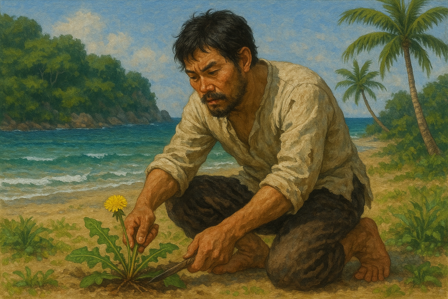 섬을 돌아다니며 여러 식물을 관찰했다. 그중에서 민들레와 비슷한 식물을 발견했다. 항염 치료와 소화에 도움이 된다고 알려져 있었다. 조심스럽게 잎을 따서 씹어보았다. 쓴맛이 났지만, 독성은 없어 보였다. 그리고 실제로 속이 조금 편해지는 것 같았다.